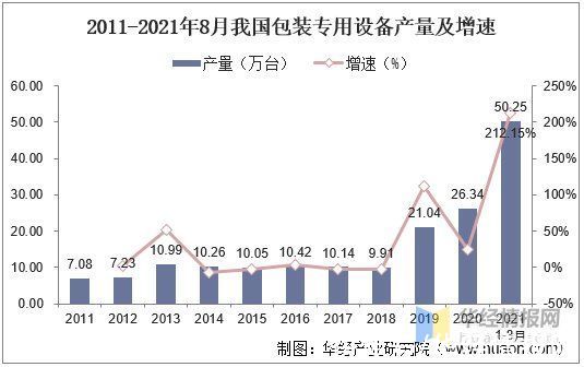 产量方面,据统计,2013-2018年我国包装专用设备产量在十万台左右,2019每年开始我国包装专用设备产量激增,到2020年我国包装专用设备产量为26.34万台,同比增长25.18%,截至2021年1-8月我国包装专用设备产量达到50.25万台,同比增长212.15%。