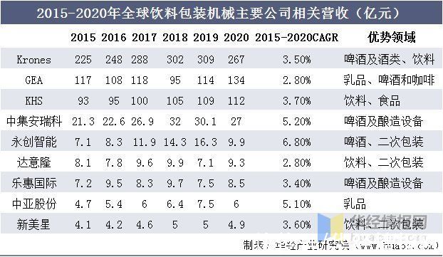 从主要包装机械公司相关业务收入来看,国产品牌在技术、资金等方面与海外同行仍有差距,2020年收入超过10亿元的仅有京山轻机(30.6亿元)、永创智能两家(20.2亿元)。在饮料包装领域,2020年永创智能相关营业收入近10亿元,过去5年CAGR为6.8%,处于国产品牌中领先水平。从业务层面看,永创智能等少数行业龙头实现前道+后道包装的产品线全覆盖,未来规模优势将进一步加大。