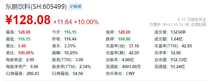 ??乐居财经讯 刘治颖 5月11日,截止10:51,东鹏饮料(SH)涨停,上涨10%,现报128.08元,成交额1.64亿元,总市值512.33亿元。